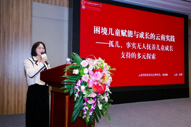 随后,云南省扶贫基金会理事长林建梅代表三家联合承办机构致辞。林理事长向在场来宾表示欢迎和感谢,特别感谢云南省民政厅多年来的关心与支持,感谢论坛主办方提供宝贵机遇使其深度参与困境儿童平行论坛筹办。林理事长简要介绍了云南省扶贫基金会基本情况以及与合作伙伴爱德基金会携手同行30多年的工作历程。重点介绍了困境儿童帮扶领域的e万行动项目(孤儿助养)。在项目区党委政府、教育部门、学校以及基层工作人员的紧密协作下,项目覆盖大理、文山、曲靖等6个州市近40个县市,1200多所学校。目前资助学生九千余名,每年资助资金两千多万元,从2010年起已累计投入1.2亿元,成效显著。为我省边疆少数民族以及经济欠发达地区的教育振兴与社会稳定贡献了积极力量。林理事长提到,近年来国务院、民政部等部委密集出台困境儿童福利保障政策,为困境儿童的健康成长筑牢了政策根基。在政策红利持续释放的新时期,公益机构如何精准对接需求,高效助力困境儿童发展,成为行业重要课题。期待通过此次论坛,凝聚各方智慧,深化多元协同,推动公益机构精准衔接政策与儿童的需求,以专业服务为困境儿童赋能,配合政府扎实推进福利保障工作,让祖国的花朵沐浴阳光、茁壮成长。