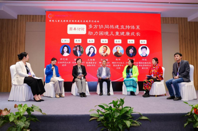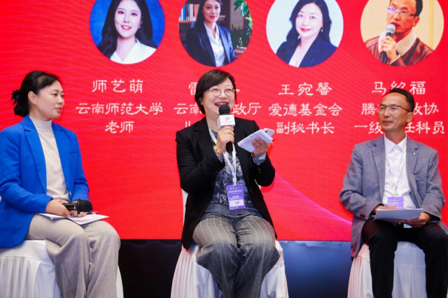 腾冲市政协一级主任科员马绍福、瑞丽市妇女儿童发展中心主任张琴、泸西县税务局爱心妈妈代表张云迎、镇雄县教体局学生资助中心副主任刘波围绕近几年困境儿童的需求变化,工作中的难点以及各自机构发挥的作用展开深入讨论与分享。
