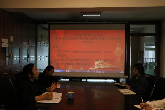 会议由秘书长蒋川黎主持。第一,秘书长蒋川黎介绍,云南省公益慈善领域突出问题专项整治工作会议是针对省级慈善机构负责人及工作人员开展的培训会议。学习内容主要包括习近平总书记关于公益慈善事业的重要指示批示精神和开展公益慈善领城突出问题专项整治的重要性、“一提示、两报告”(公益慈善领域专项整治工作提示、慈善组织等从事公益活动的社会组织自查自纠事项报告表、慈善组织等从事公益活动的社会组织负责人自查自纠事项报告表)讲解以及公益慈善领域突出问题专项整治警示教育三个方面的内容。她回顾了会议的主要内容传达了会议精神,并提出不管是法人还是工作人员在开展慈善公益工作中都要依法依规开展相关工作,坚持中国共产党的领导,每个工作人员必须要对自己的工作内容保密,要不断学习,提升思想认识。